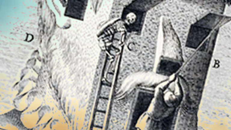 Σε μια άλλη από τις τρύπες του προσώπου αυτής της γκραβουρας, μας παρουσιάζεται η σκελετική μορφή του θανάτου, σημαδεμένη με το γράμμα C. Γιατί; Επειδή όλα όσα συμβάλλουν στην τύφλωσή μας, μας προετοιμάζουν να συνεχίσουμε να είμαστε σκλάβοι της ψυχολογικής μας ύπνωσης και αργά ή γρήγορα, θα καταλήξουμε στα χέρια του θανάτου. Θα έχουμε ζήσει χωρίς να γνωρίζουμε για ποιο λόγο ζούμε, τρέφοντας μόνο τις εντυπώσεις των οποίων ήμασταν πρακτικά σκλάβοι, δηλαδή: το αυτοκίνητο, το ρολόι, τη μόδα, το σεξ, τη λαιμαργία, την υπερηφάνεια, την τεμπελιά, τη φιλοδοξία κλπ. κλπ. κλπ.